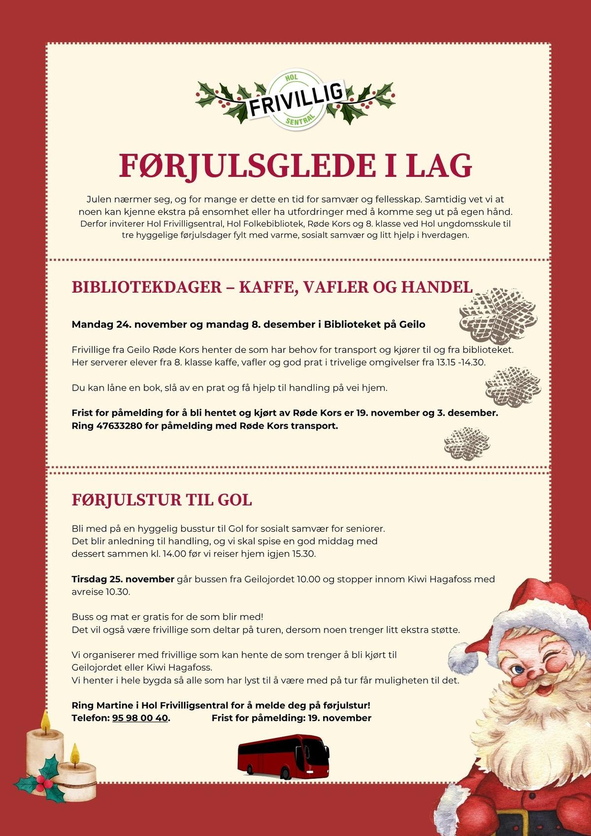 I samarbeid med Røde Kors, 8. trinn og Hol Folkebibliotek inviterer Hol Frivilligsentral til kaffe og vaffel i biblioteket på Geilo mandag 24. november.
